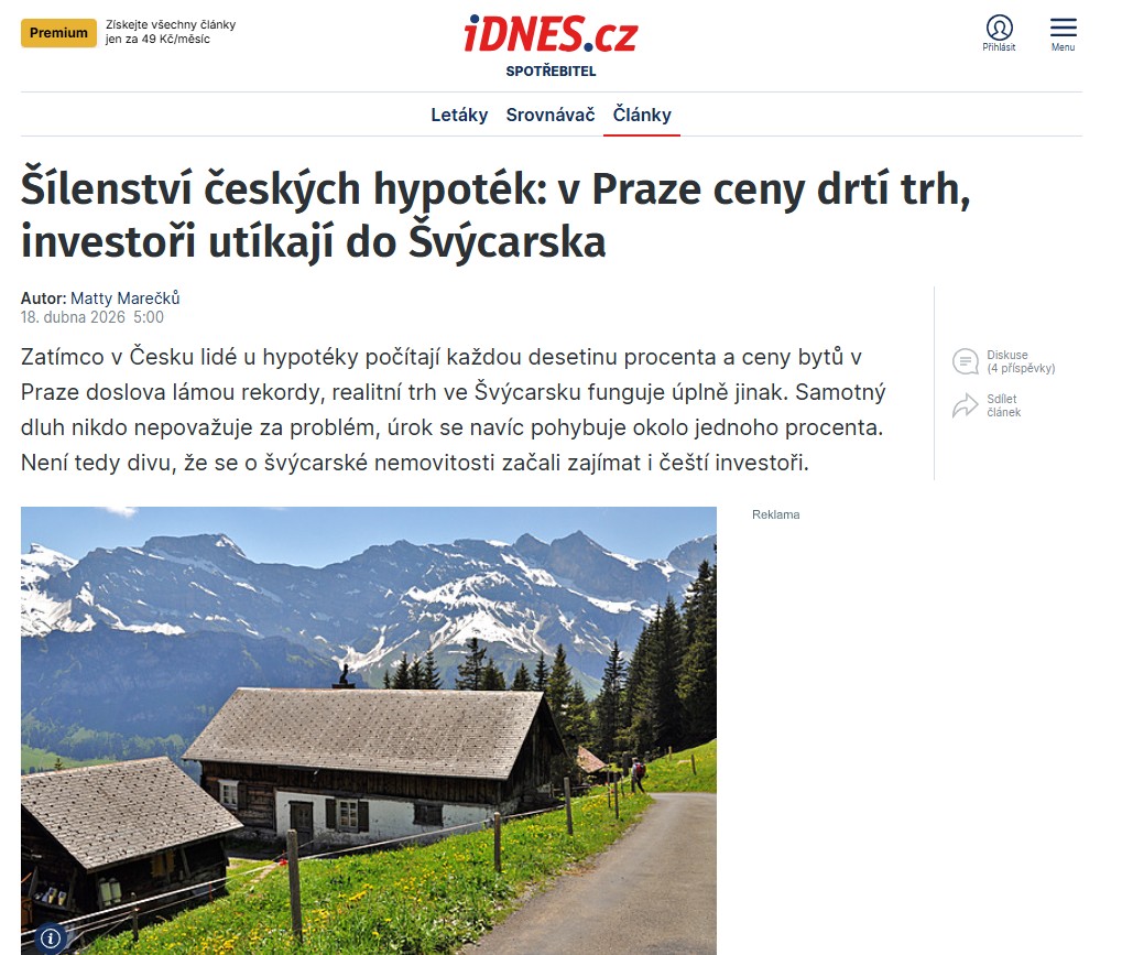 Zpravodajský portál iDNES.cz se ve svém článku Šílenství českých hypoték: v Praze ceny drtí trh, investoři utíkají do Švýcarska věnuje aktuální situaci na českém realitním trhu, kde rostoucí ceny nemovitostí a drahé financování stále více komplikují dostupnost bydlení i investiční příležitosti. Text zároveň poukazuje na trend odlivu části kapitálu do zahraničí, zejména do stabilních destinací, jako je například Španělsko nebo Švýcarsko.